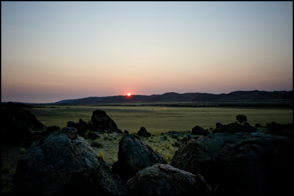 Appena fuori Maltahohe finiscono gli agi; la strada, sempre che possa essere chiamata così, si trasforma in una pietraia. E’ importante mantenere un’adeguata distanza dai veicoli che ci precedono; i sassi sotto i pneumatici dentati delle Jeep potrebbero trasformarsi in proiettili che incrinerebbero fanali o parabrezza. Ma ci accorgiamo subito che questo problema quasi non sussiste; siamo soli, non si vedono vetture né in un senso di marcia né in quell’altro. Abituati al traffico stradale europeo, il salto è davvero notevole. Anche le poche stazioni radio, con musica folk africana, ci abbandonano; stessa sorte tocca all’ultima tacca di segnale del cellulare. E’ ufficiale, ora siamo veramente soli, ma in fondo non era quello che cercavamo? Guardo la strada scorrere negli specchietti retrovisori mentre la mia auto sembra una navicella lanciata nel vuoto, con una scia di fumo che si alza in cielo; mi ricorda quei documentari dove alcune vetture sfrecciano su laghi salati. Ma qui non corriamo assolutamente e anzi tengo gli occhi ben attenti nell’evitare buche, dossi, pietre troppo grosse o acuminate, anche se la nostra Nissan scoda ad ogni avvallamento. E’ come se fossi alla prima lezione di scuola guida, ma è tutto così emozionante. Il paesaggio è intanto mutato radicalmente dal dolce deserto del Kalahari fatto di soffici colline di sabbia rossa e di bush giallo paglierino; come in un immenso teatro, cambia la scena attorno a noi. Alla nostra sinistra si stagliano le montagne del Nubib, e in mezzo la più vasta riserva naturale privata del paese, la Namib Rand Nature Reserve. Sembra un quadro fiammingo, appena dipinto data la vivacità del verde, del rosso e del blu; le alture diradano morbide sulla pianura, creando effetti cromatici diversi ad ogni altitudine. Sembra tutto vicino, ma la catena montuosa è probabilmente a non meno di qualche decina di km da noi; ai suoi piedi c’è uno dei più eleganti resort di tutto il continente, il Wolvedans. Ma strutture così rinomate e qualitativamente preparate, hanno tempi di prenotazione biblici; però dormire in una delle sue ville con le stelle a vista, grazie al soffitto trasparente, deve essere un’esperienza notevole.